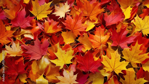 Vibrant, scattered, and overlapped red, orange, and yellow maple leaves form a dense, textured background, evoking the warm, golden hues of autumn. The leaves edges are slightly curled and wilted,