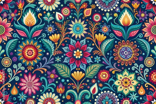 Vibrant seamless pattern featuring colorful ornamental shapes, intricate florals, and whimsical decorative elements, ideal for wallpapers, fabrics, and graphic design backgrounds.