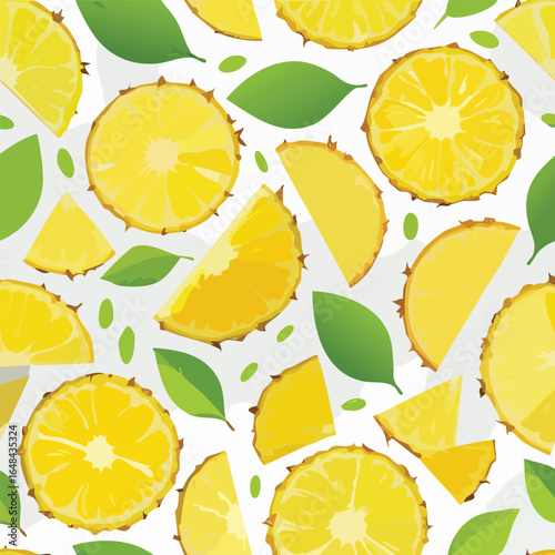 Vibrant seamless pattern featuring sliced pineapple pieces and green leaves scattered on a white background.