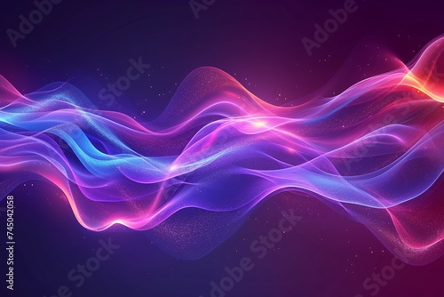 Vibrant see-through fluid flow with violet neon wave and blue luminous lines on a dazzling background, creating a fiery light trail and glowing curves.