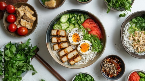 Vibrant shot of Kuay Jap noodles with tofu and pork slices, arranged on a seamless white surface. --chaos 20 --ar 16:9 --quality 2 --v 6.1 Job ID: 7bd46e23-f824-4d0d-b10b-d9bd149daa7d