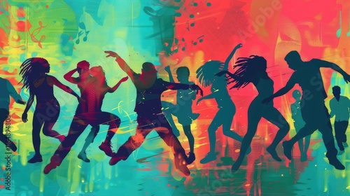 Vibrant silhouettes of people dancing against a colorful abstract background.