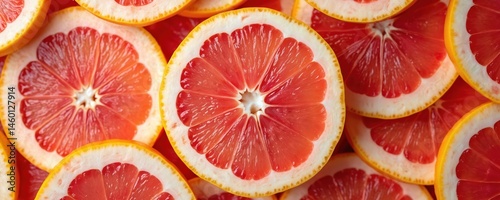 Vibrant slices of fresh pink grapefruit arranged in colorful pattern. Juicy fruit with yellow rind offers refreshing summer vibes, vitamin nourishment, health benefits.