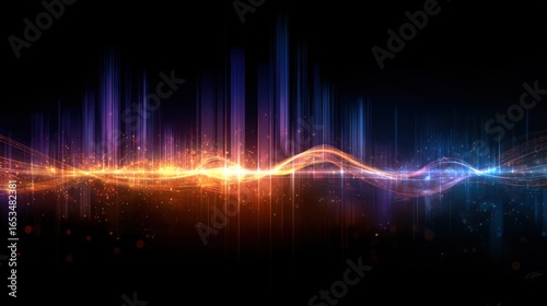 Vibrant sound wave visualization with pulsating lights and abstract energy trails