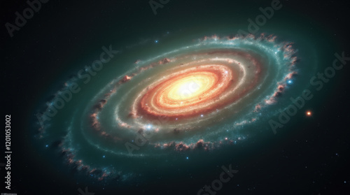 Vibrant spiral galaxy illuminated by a bright central star with colorful nebulae and stellar formations