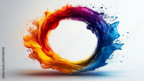 Vibrant splash of multicolored paint forming a circular shape on a white background. Generative AI