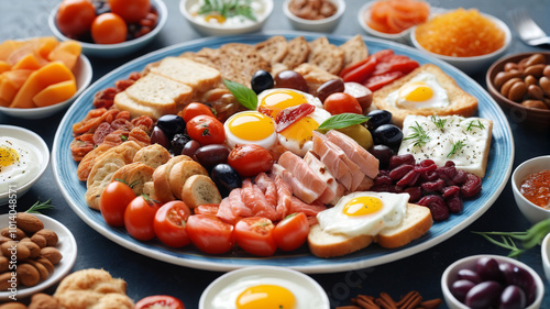 Vibrant spread of Turkish breakfast delights with an array of sweet and savory treats, Generative AI