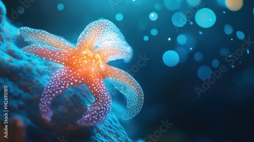 Vibrant Starfish Underwater in a Colorful Ocean Scene with Blue Bubbles and Coral Background