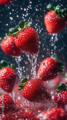 Vibrant strawberries with green leaves splash in water against a red background. The juicy, shiny fruit creates a fresh, dynamic visual.