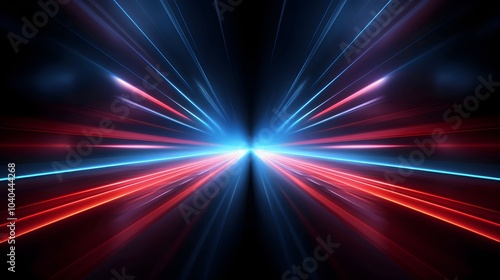 Vibrant streaks of blue and red light converge in a dynamic burst, creating a mesmerizing display of energy in a dark environment