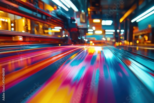 Vibrant streaks of color blur across a printing press. Illustrates speed, efficiency, and modern printing technology.