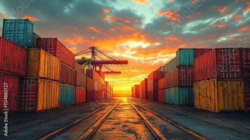 Vibrant Sunset at Shipping Yard with Colorful Cargo Containers and Cranes