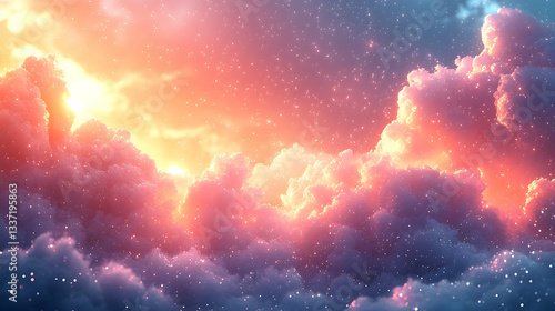 Vibrant sunset hues paint the sky, fluffy clouds illuminated with sparkling dust. Dreamlike, ethereal scene