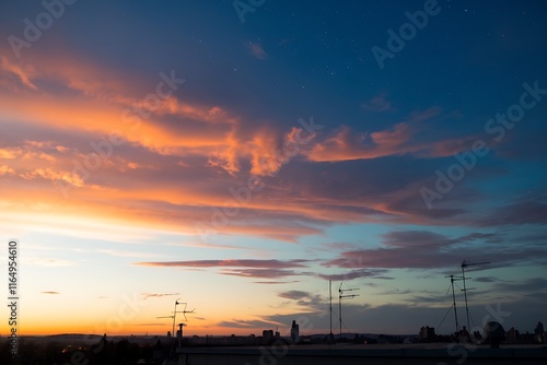 Vibrant sunset hues paint the sky, with fluffy clouds above a city skyline. Antennae silhouette against the colorful backdrop.