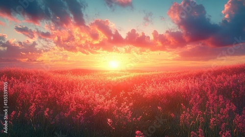 Vibrant Sunset Over Blooming Field With Pink Flowers and Dramatic Sky
