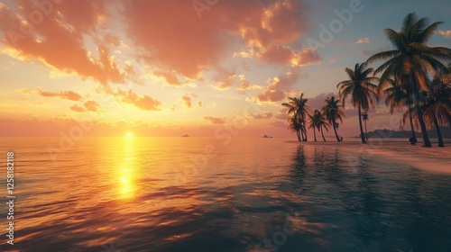 Vibrant sunset over tranquil ocean with palm trees lining the shore on a warm evening. Generative AI