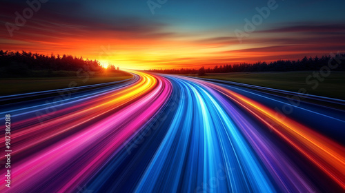 Vibrant sunset with colorful light trails on a highway, showcasing motion and energy in a scenic landscape.