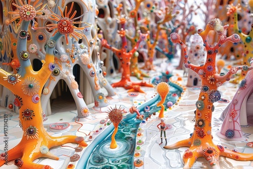 Vibrant Surreal Landscape With Colorful Trees and Flowing Stream at Daytime