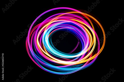 Vibrant swirling light trails in a circular pattern against a black background, creating dynamic energy