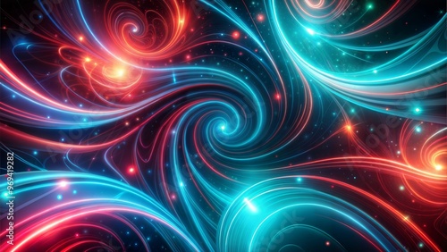 Vibrant swirling light trails in red and blue colors against a dark background for abstract art