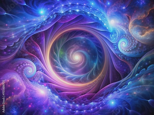 Vibrant, swirling patterns of purple and blue energies spiral outward, emanating from a central vortex, evoking a surreal, otherworldly atmosphere of mystic exploration.