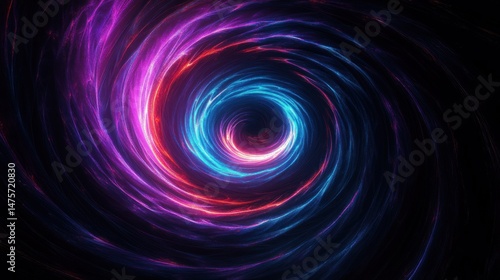 Vibrant swirling vortex of glowing neon colors blending purple, red, and blue light in dynamic spiral motion on black background, evoking energy and mystery