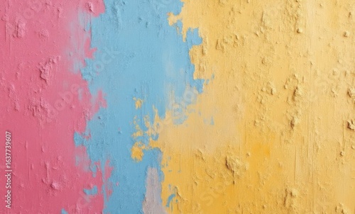 Vibrant texture of peeling paint in pink, blue, and yellow creates an artistic backdrop.