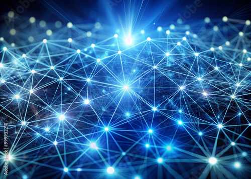 Vibrant threads of light weave together, creating stunning digital web that symbolizes connectivity and technology. This intricate network showcases beauty of modern data flow and communication