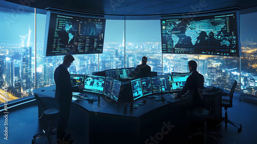 Vibrant Trading Desk Scene, Traders Engaged in Analyzing Trade Outlook Across Multiple Screens, Displaying Intense Market Focus.