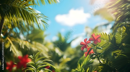 Vibrant tropical foliage and flowers in a lush serene landscape