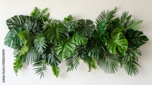 Vibrant tropical foliage display featuring lush monstera and palm leaves creating a natural border on a clean white background.