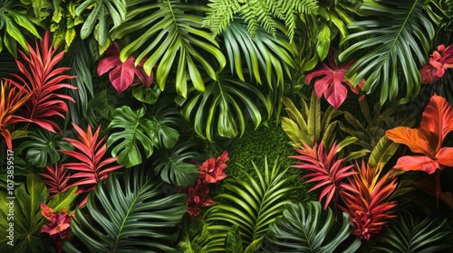 Vibrant tropical foliage showcasing a variety of green and colorful leaves in a lush, natural setting.