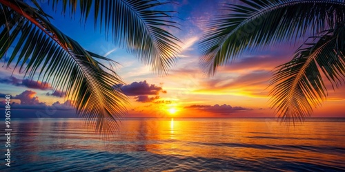 Vibrant tropical sunset over calm ocean with palm leaves silhouette