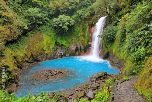 Vibrant turquoise pool at a waterfall in lush rainforest