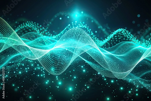 Vibrant turquoise wave of glowing particles undulates across a dark digital background, evoking a mesmerizing audio visualization of electronic dance music's pulsing energy.