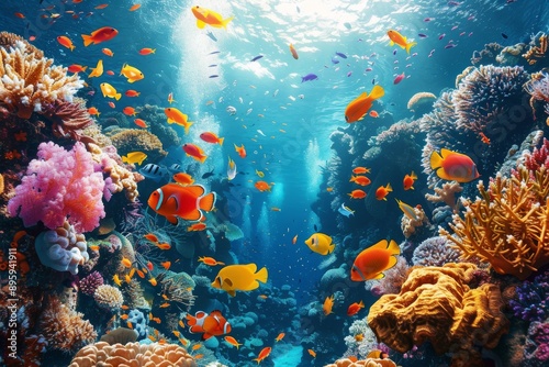Vibrant underwater coral reef with colorful fish.