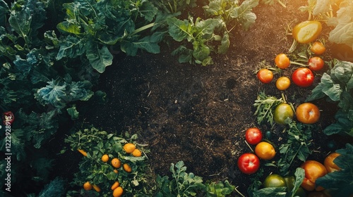 Vibrant urban community garden with fresh vegetables and empty space for text highlighting sustainable farming practices