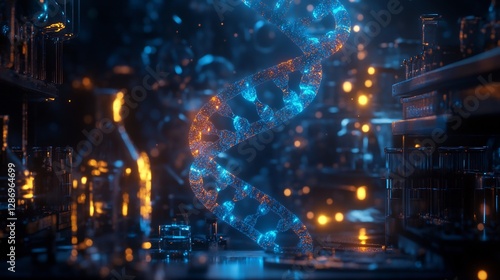 Vibrant visualization of DNA double helix glowing bioluminescent energy dark laboratory setting intricate molecular bond illuminated neon hue hyper realistic detail photo realistic texture cinematic