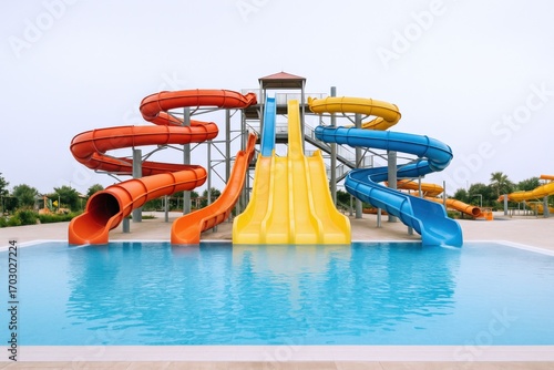 Vibrant water park featuring colorful slides, pools, and towers, creating a fun and exciting recreational environment