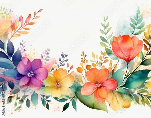 vibrant watercolor blooms and foliage form an exquisite border against a white backdrop