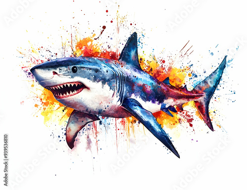 Vibrant watercolor illustration of a shark with colorful splashes and dynamic details, perfect for marine and ocean-themed projects.