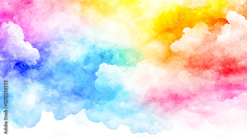 Vibrant watercolor rainbow with multicolored clouds, cheerful clip art illustration, vector graphic on a flat white background, perfect for creative designs and digital projects