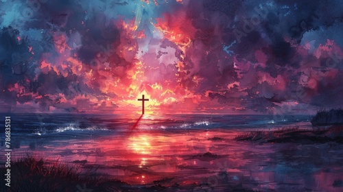 Vibrant watercolor-style artwork showcasing a Christian cross, positioned against the backdrop of a serene beach at sunset. Christianity concept with ample space for text