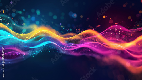 Vibrant waves of colorful glowing particles on a dark background, representing technology, fantasy, and futuristic connections.