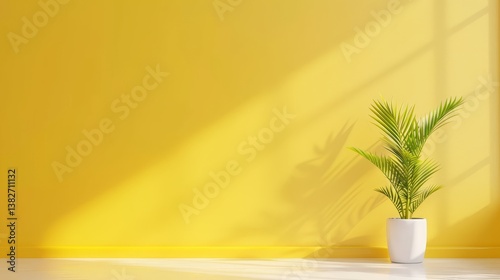 Vibrant yellow wall accented by a lush green potted plant, touch of nature in home decor