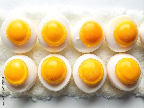 Vibrant yellow yolks glisten in a row, surrounded by crispy whites, against a clean white background, perfect for breakfast or brunch culinary creations.