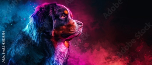 Vibrantly colored artistic portrait of a dog, blending realistic detail with abstract hues of blue and pink against a dark background.
