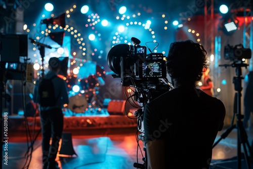 Video camera operator working with his equipment at indoor event, cameraman is filming an entertainment show
