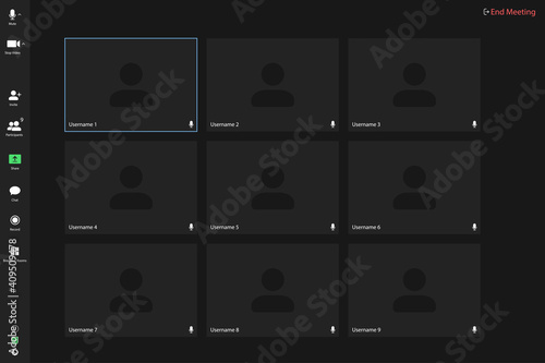 Video conferencing user interface. Video call screen interface template. Application for social communication. Video conferencing window overlay. nine users.