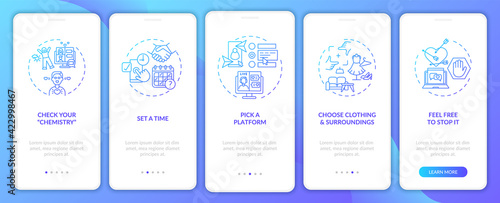 Video dating tips onboarding mobile app page screen with concepts. Pick platform for talking walkthrough 5 steps graphic instructions. UI, UX, GUI vector template with linear color illustrations
